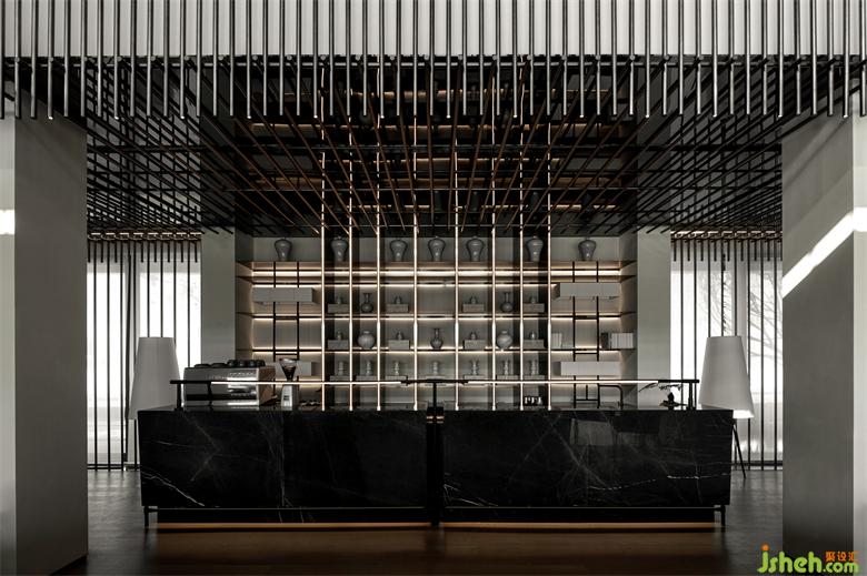 仿銅金屬圓管陣列有序、水墨痕的灰色理石氣勢沈穩(wěn),淺咖色實木有節(jié)奏的縱橫交錯……編織出紋理豐富的水吧區(qū)立面,而立面則是壹個連綿不斷的平面,多重材質之間的轉換交替通過不同肌理一致的方向性達成統(tǒng)一,接待、陳列等輔助功能區(qū)域則在這些立面之后鋪陳展開。用豐富的透明性表達空間關系也延續(xù)到了這些不同的立面——借助橫豎交錯的燈光,建筑外部的竹林景觀成爲室內中央核心區(qū)的背景圖,而功能性立面則透露出更隱約、含蓄的朦朧之美。