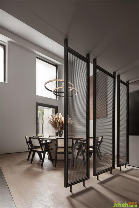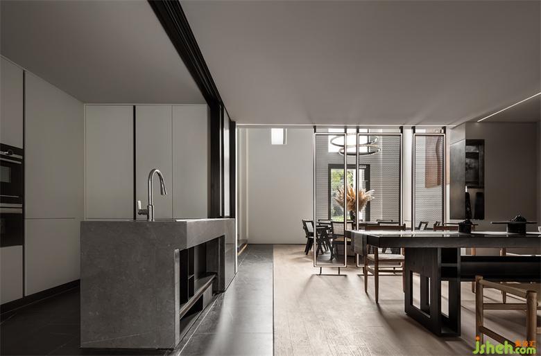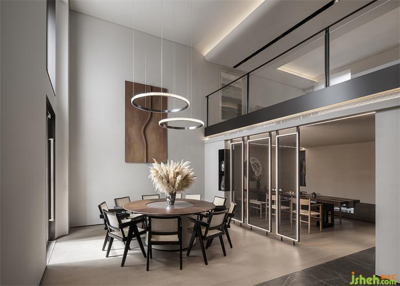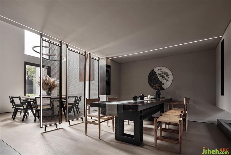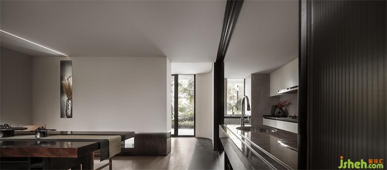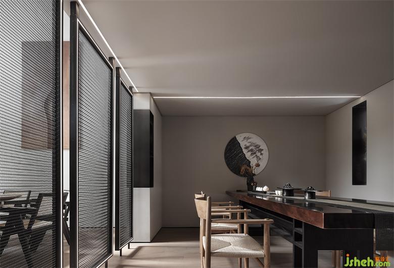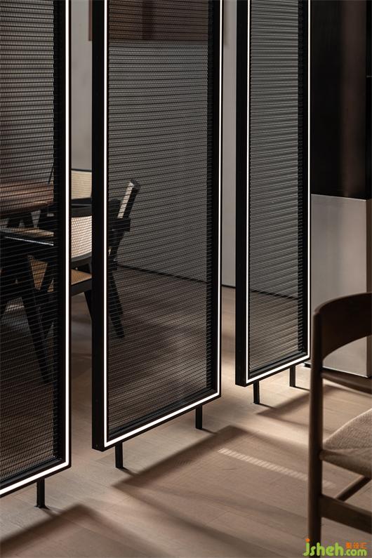 前廳的島臺與水吧臺透過墻體穿插連續(xù)在一起,“天際線”的光線延續(xù)了空間,將彼此牽引在一起。武漢會所設(shè)計平滑細膩黑鈦不銹鋼與富有肌理感的微水泥塑造沉靜感的異形空間,溫潤的木皮與冰冷的石材裝裱空間的張馳華麗。