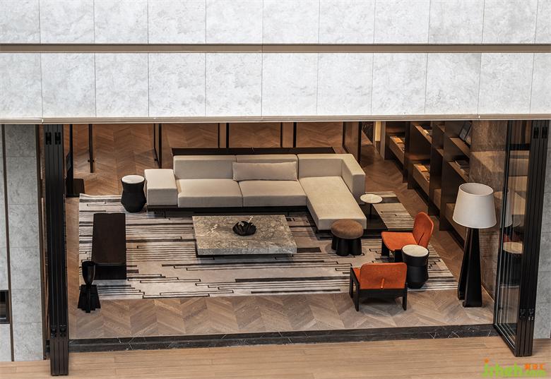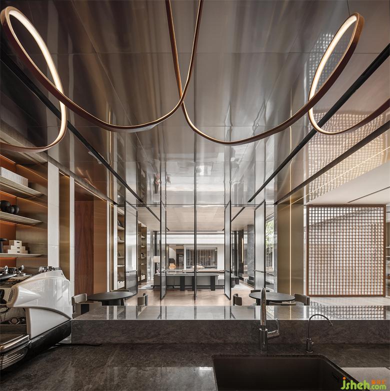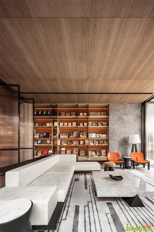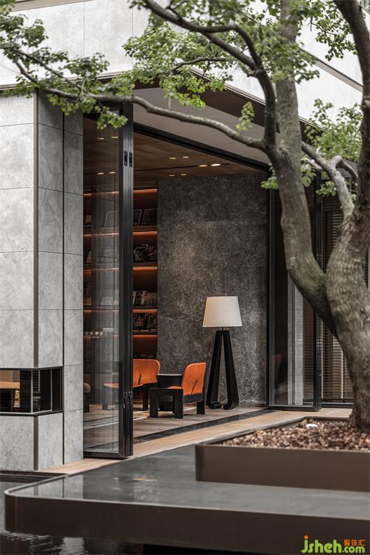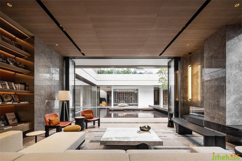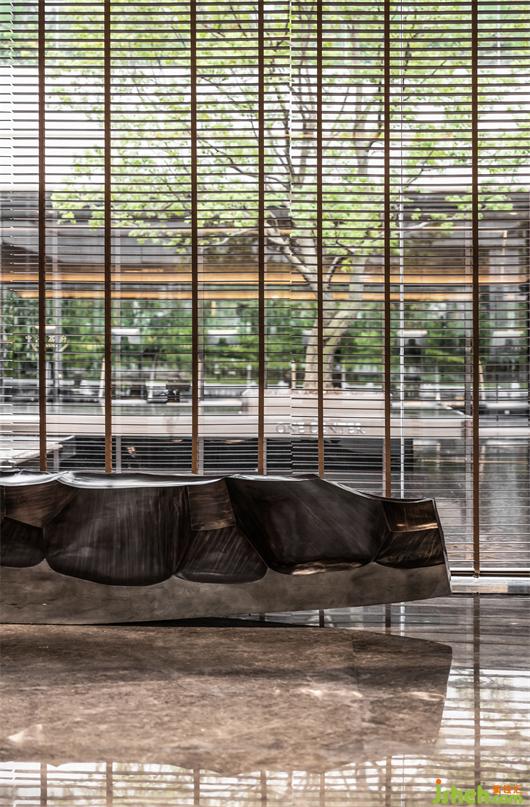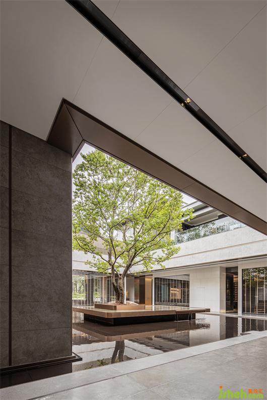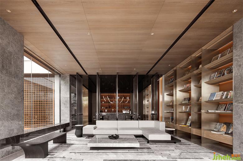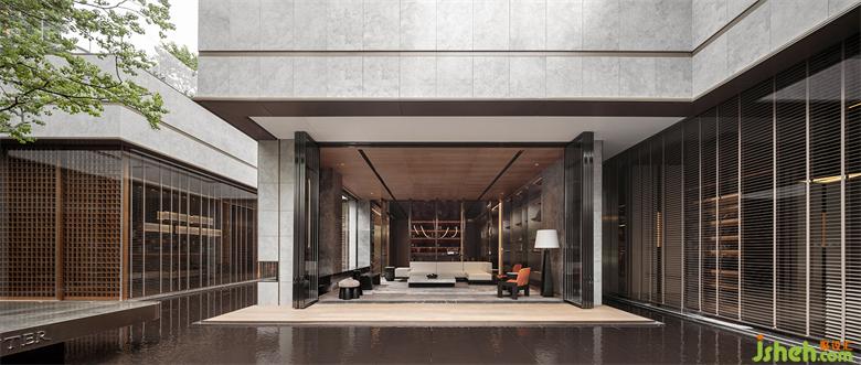 本案建筑量體為五棟塔樓,一層為庭園景觀連接戶外露天泳池及吧臺區(qū),中間開有口字型大型采光天井,會所設計將光線及自然景觀引入負一層的會所空間,透過中庭水面的波光反射創(chuàng)造空間中的戲劇性。