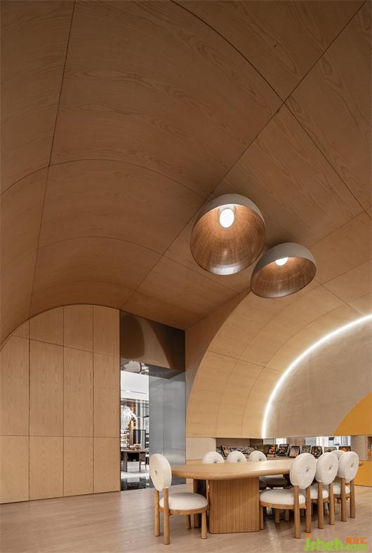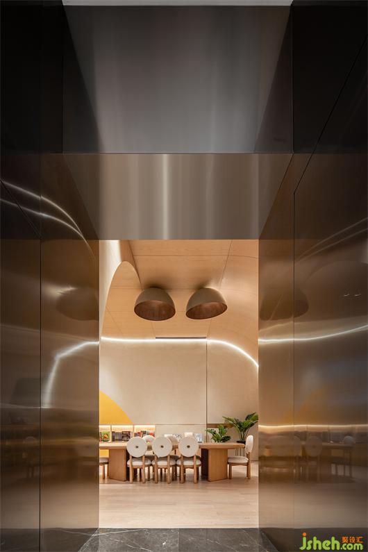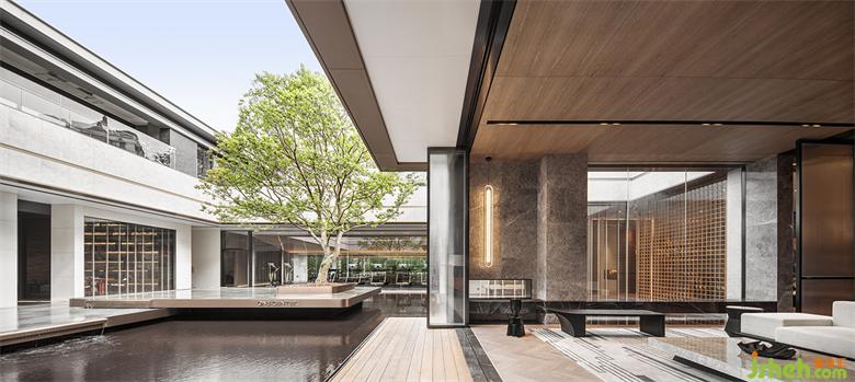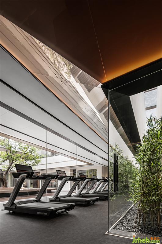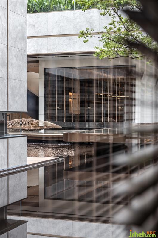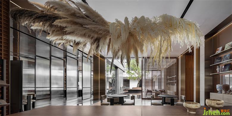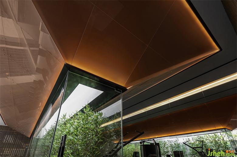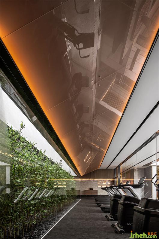 會所設計材料選擇上取自增城掛綠的意象,翠綠樹海中的一抹赭紅,我們試圖以木、銅、赭色皮革等材料,帶出溫潤而雅致的空間質(zhì)感。