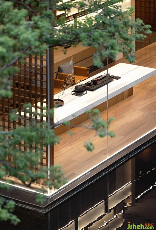 在漂浮的兩個盒子中,洽談區(qū)透過折門的運用,將沙發(fā)區(qū)整體空間打開與中庭水面連結(jié),將內(nèi)外空間連成一體,雨天時可以在沙發(fā)上細聽雨聲。茶室則是以較低臺度的家具設(shè)定,接近席地而坐的高度讓使用者與水面的尺度感更親近一些,并透過格子窗扇,在黃昏時讓交錯的光影灑落在茶室的空間之中。