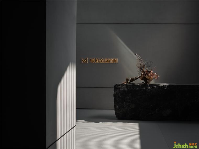 在入口處水洗石的臺階燈光將參觀者逐級而上引至一面玻璃窗前,從中可以瞥見展廳內(nèi)的一小部分作品,猶如為展廳準(zhǔn)備的一段序言。再往前轉(zhuǎn)折是一條悠密的長廊,其靠水一側(cè)增加了簡單的線性金屬構(gòu)件,用于容納照明器具并引導(dǎo)參觀者進(jìn)入展廳內(nèi)部。佛山瑪格展廳裝修設(shè)計與展廳中的藝術(shù)品一樣,這項簡單的裝置亦在試圖創(chuàng)造一種直接而又打動人心的體驗。