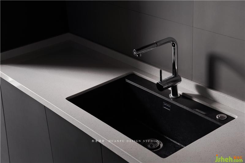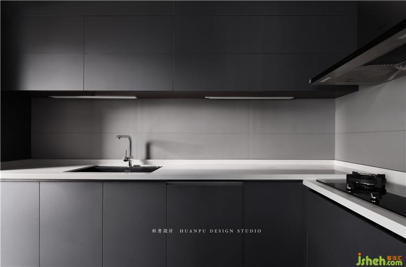 黑白灰色調(diào),L型的櫥柜設(shè)置,把空間實(shí)用性發(fā)揮到極致。干凈整潔,仿佛是把雜志宣傳圖里的廚房搬回來(lái)了家。