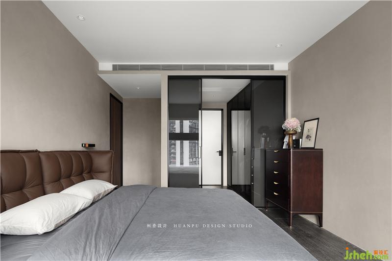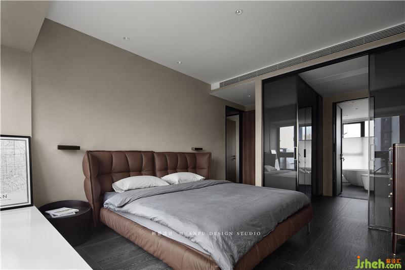 床頭背景設(shè)置極簡(jiǎn)的壁燈,增添了氛圍感。步入式衣帽間,用玻璃移門(mén)作為臥室與衣帽間之間的分隔,玻璃材質(zhì)的通透性,雖隔斷空間卻不會(huì)顯得擁擠壓抑。
