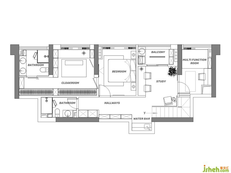 2.一層臥室作為父母房使用,把公衛(wèi)的面積納入父母房,在原公衛(wèi)的位置做成衣帽間。再將原衣帽間的位置與原次衛(wèi)打通,做成干濕分離的衛(wèi)生間。