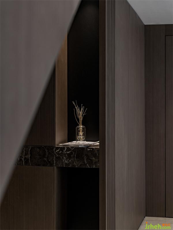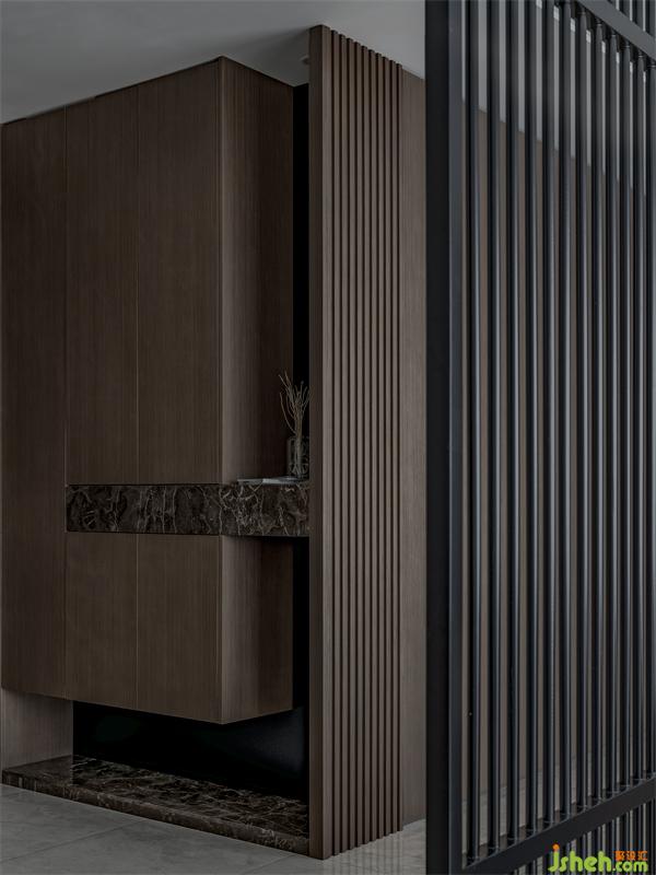 玄關(guān)鞋柜運(yùn)用了木質(zhì)材質(zhì)和大理石的拼接,提升了層次感與設(shè)計感。柜子里還能放置出門必備的東西,如充電寶、遛狗用到的工具等,大大節(jié)省了出門的準(zhǔn)備時間。