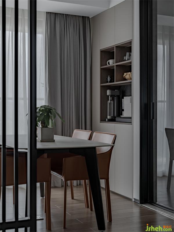 餐桌旁還設(shè)計了一個餐邊柜,中間是展示柜,可放置咖啡機(jī)、蘇打水機(jī)器等。而上下都是儲物柜,放一些狗狗罐頭等。