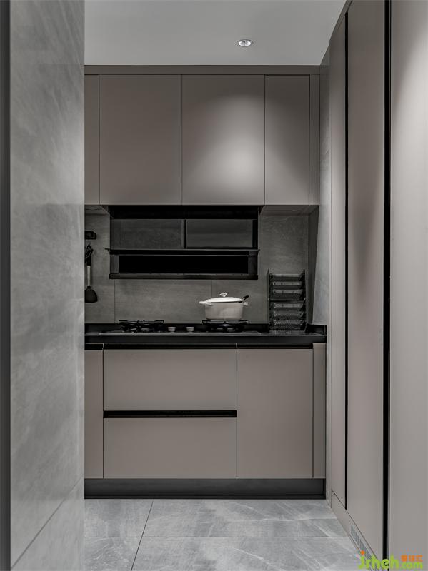 餐桌旁就是廚房,進(jìn)門右側(cè)是蒸烤箱,再往里走能看到邊上很多柜子。只要我不說,你肯定不知道這里放了嵌入式冰箱,不僅節(jié)省空間還很美觀。灶臺使用的是黑色巖板,看起來更時尚高級。