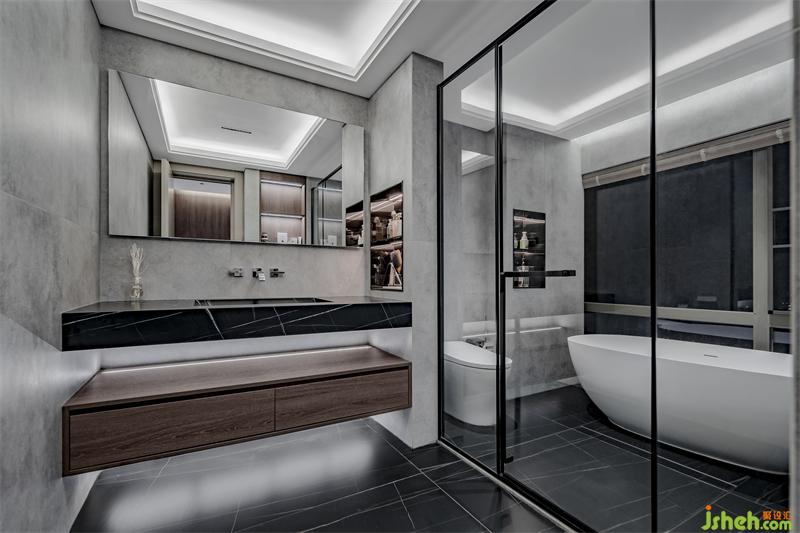 次衛(wèi)采用干濕分離,盥洗區(qū)分體盆用的是黑色巖板,與灰色墻面相輔相成。這里的盥洗盆用的是暗埋龍頭,這個“盆”不像傳統(tǒng)盥洗盆能儲水,因為它是一個斜面,看起來更加精致漂亮。干區(qū)濕區(qū)都有設(shè)計壁龕,可以放置洗浴用品和護(hù)膚品。