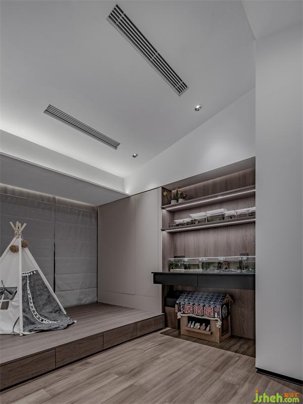 業(yè)主把這里暫時作為貓房,養(yǎng)了兩只非??蓯鄣男∝?。這個天花特地做成了小屋頂?shù)母杏X,有點童趣感,設(shè)計靈感源自于他們兩在美國留學(xué)時的閣樓,以后也可作為兒童房的備用。我們還做了一個榻榻米的家居設(shè)計,木板底下是抽拉式儲物抽屜,目前是拿來放置貓貓使用的物品。邊上的展示柜拿來放業(yè)主的另一群寵物——寄居蟹,簡直就是動物的天堂。