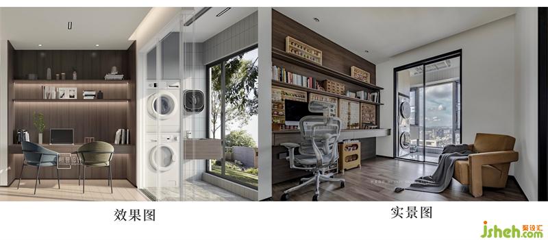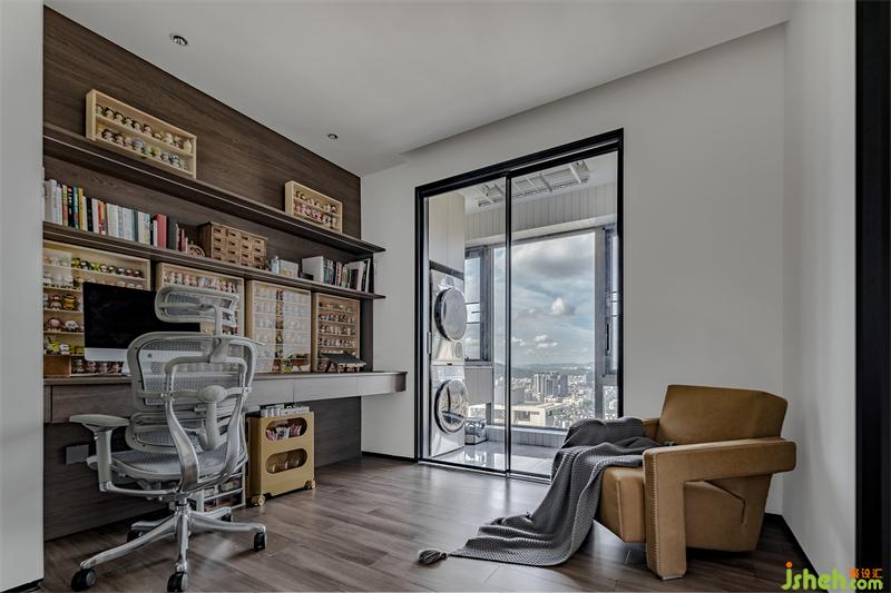 從樓梯一上來就可以看到這個開放式書房,首映眼簾的就是女主人的盲盒墻,為簡潔的空間帶來了一抹可愛色彩。書房旁有個生活陽臺,不僅有洗衣機(jī)烘干機(jī),還有自動晾衣架。滿足了日常盥洗需求,同時也增加了書房的無限采光。