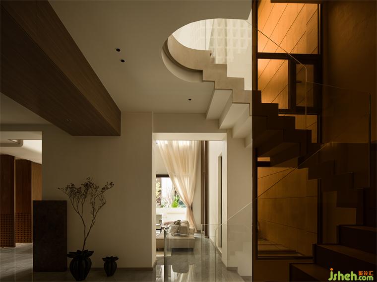 負(fù)二層樓梯形構(gòu)與酒吧結(jié)合如空間靜態(tài)雕塑。