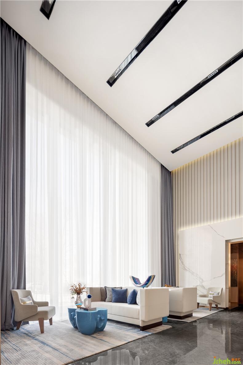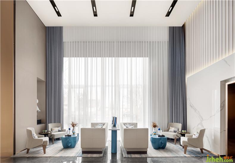 全落地窗構(gòu)造出富有力量感的大挑高空間,與墻面淺灰色肌理相得益彰,售樓處設(shè)計帶來充分的透明感與開放感,人的感受也因此豐富起來。