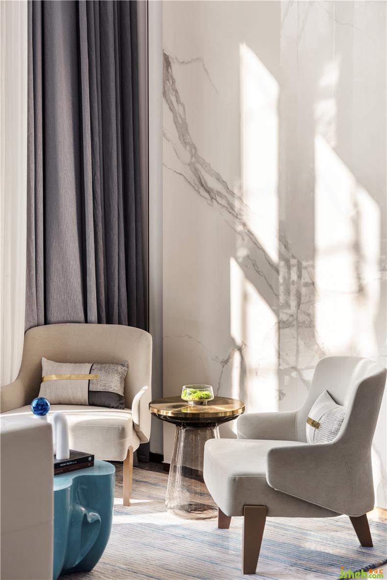跟隨室內(nèi)層高,我們形塑出空間的體量感與連續(xù)性,白色大理石白和波紋板分割空間高低,售樓處設(shè)計打破沉悶的立面。水之藍(lán)的純凈則賦予空間靜謐安寧的氣質(zhì),當(dāng)我們處在平靜自在的環(huán)境中,感官也自然地沉浸于此。