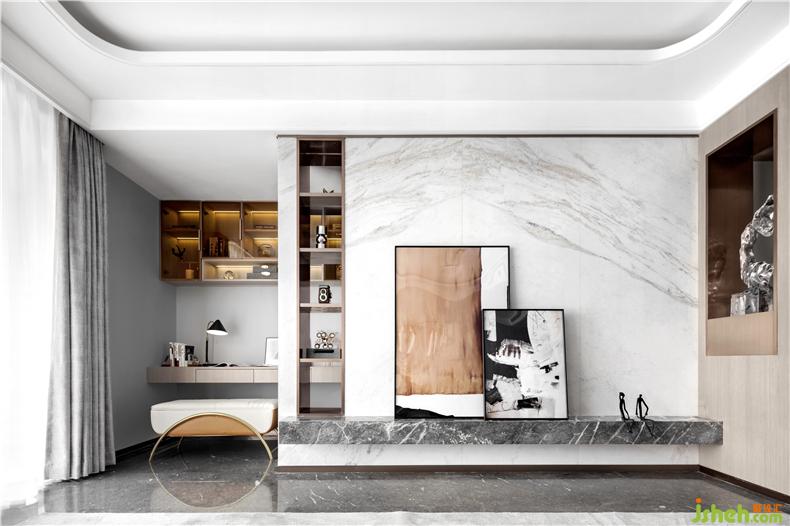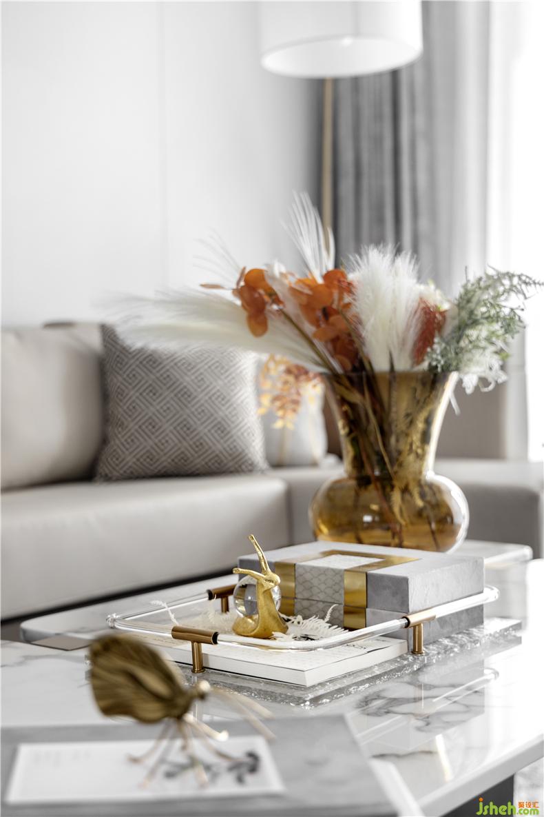在這詩意之下,光滑的大理石映上清晨的冬日,增添了一份專屬的靜謐。素雅的空間色彩以及有序擺放的藝術(shù)擺件,在明亮的光線下慢慢浸潤出質(zhì)感。樣板房設(shè)計
