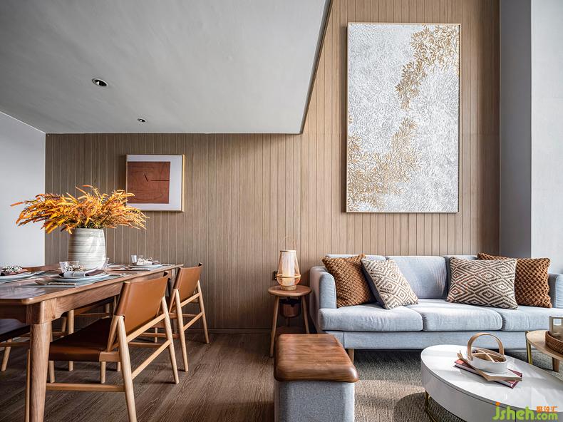 那一抹藍(lán),從秋天的日光中浮現(xiàn),豐富了空間的層次感。日照輕紗下的客廳,帶著溫暖色澤的軟裝飾品,樣板房設(shè)計(jì)給人以無限遐想