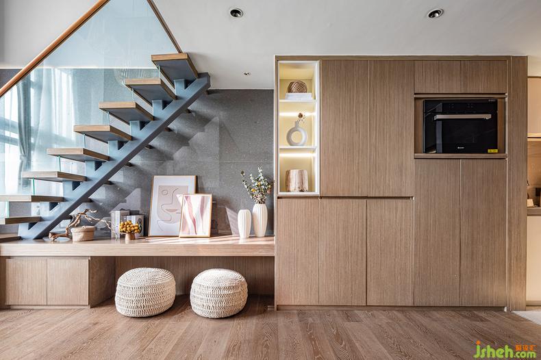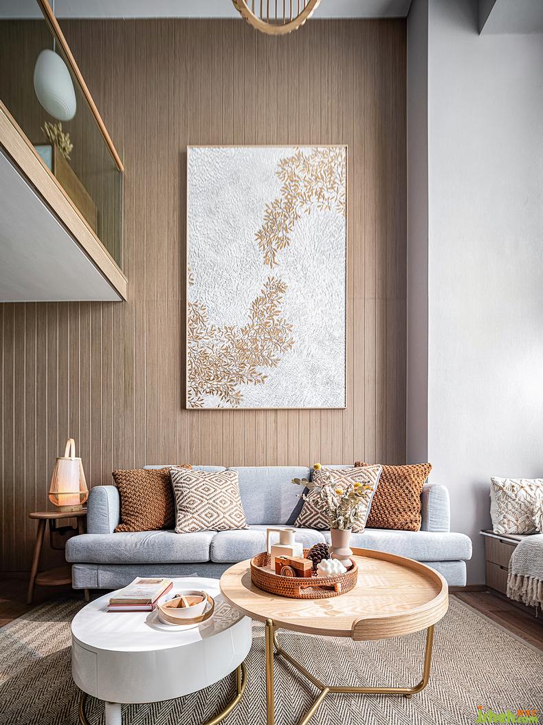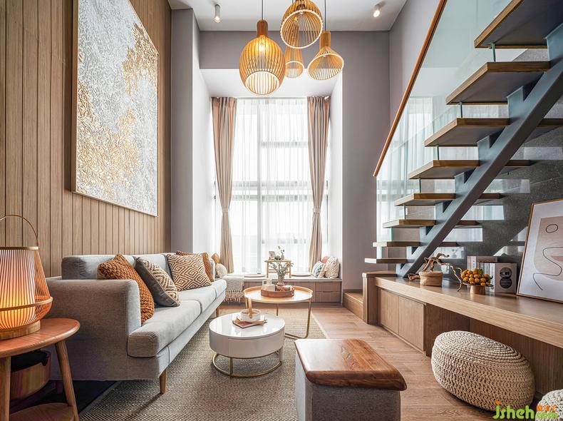 約4.5米的層高消除了空間的閉合感,木色沿著過道爬上地面和墻面,帶來秋天恬靜的氣息。樣板房設(shè)計(jì)籐編藝術(shù)吊燈與光的柔美結(jié)合,充分體現(xiàn)出自然材質(zhì)的美感