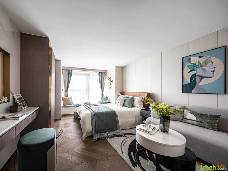 藍(lán)綠色作為藍(lán)色和綠色的混合色,代表一種甜美的女性特質(zhì),樣板房設(shè)計而較淺的藍(lán)綠色可以創(chuàng)造出魅力十足的女性氣質(zhì)。本案中,設(shè)計師以白色為主,混入藍(lán)綠色,營造出獨(dú)特的雅致感,以此契合居者的氣質(zhì)