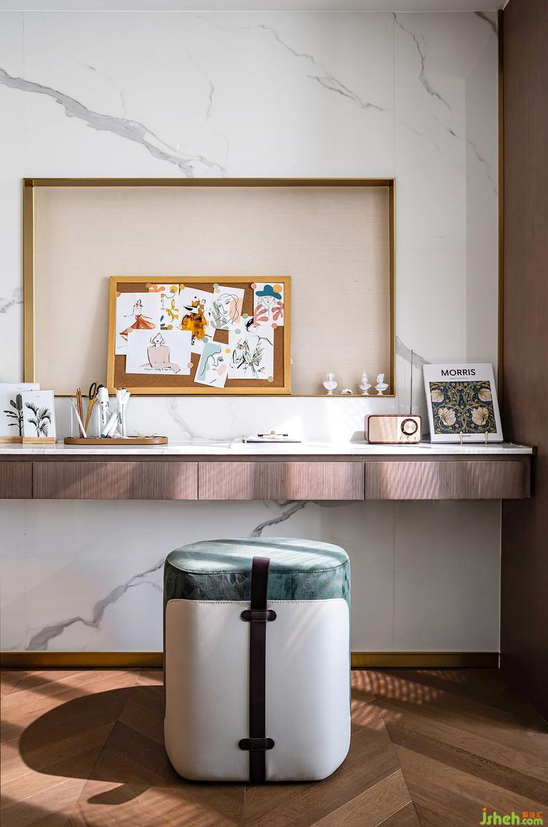 在現(xiàn)代女性的居所中,化妝間與工作臺缺一不可。因空間的局限性,我們將其合二為一,真實(shí)而自然的生活氣息不經(jīng)意間流露樣板房設(shè)計