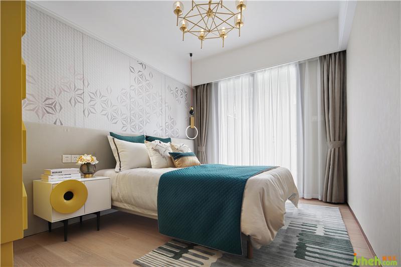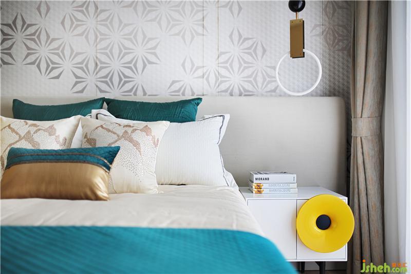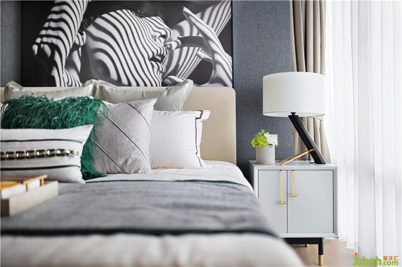 黑白灰的光影,暖暖的窗簾和床呼應(yīng),安靜溫暖的床,是小兩口最私密的空間,床頭是他們最愛的攝影作品,床上祖母綠流蘇抱枕正是女人柔美的象征。樣板房設(shè)計