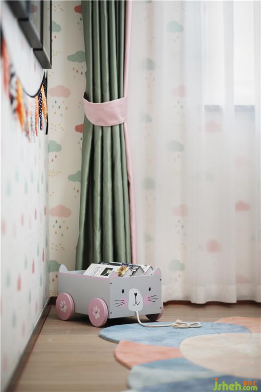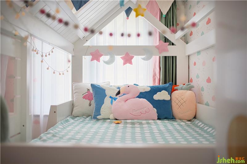 女兒乖巧可愛,是爺爺奶奶開心果,房型床是他們給她最好的保護,一個屬于她一個人的空間;星星月亮只屬于她一個人,床上都是她喜愛的樣式抱枕。樣板房設(shè)計