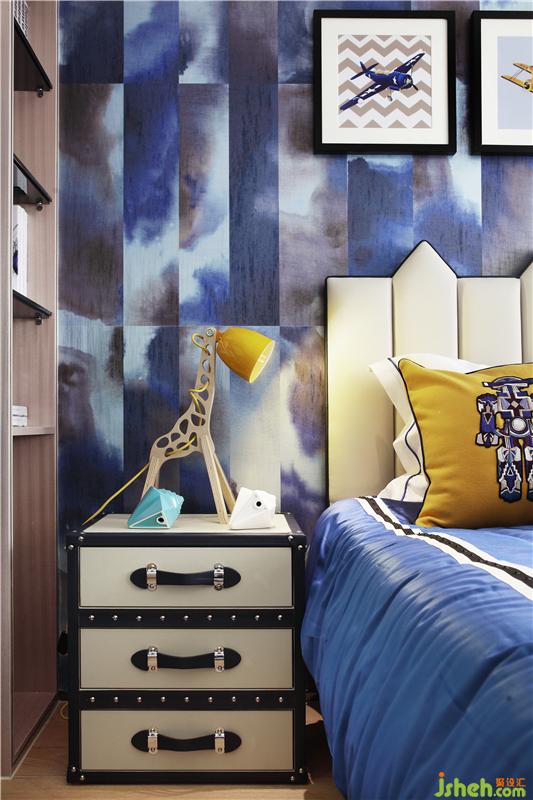 男孩房采用深藍(lán)的色調(diào)更突出男生的沉穩(wěn)和理性,明黃顯得輕快,地毯的幾何分割活躍了空間的氛圍。臥室?guī)в幸唤z英倫風(fēng),融入氣質(zhì)藍(lán)色皮革,酷酷的風(fēng)格讓我們想見小主人的十足個(gè)性。但足球,似叛逆,似向往,又凸顯了孩子調(diào)皮的一面。
