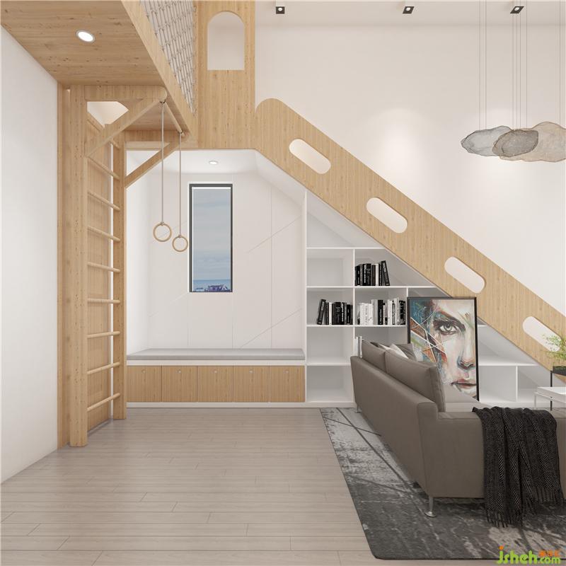 客廳整體線條分明,大面積的留白給空間多了更多想象的余地。打破了傳統(tǒng)的空間布局,在客廳空間增添了娛樂空間讓空間的功能定位多了更多可能性,有著不一樣的空間呈現(xiàn)方式。比如滑滑梯與置物架的組合,攀爬架與二樓空間的完美聯(lián)動。裝修設(shè)計