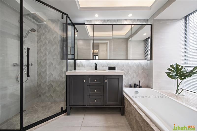 良好的采光,大塊面的鏡面,界面幾何磚的拼接,在視覺上延伸了空間感。主衛(wèi)收納空間充足,功能齊全,不同的材質(zhì)在色調(diào)上達成統(tǒng)一。裝修設(shè)計