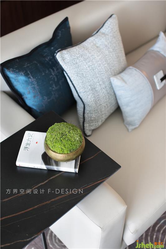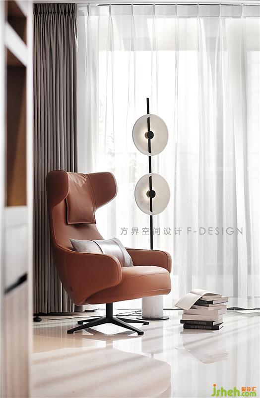 而旁選用一盞落地?zé)糇鳛檠b飾,旁邊的橘色單人沙發(fā)椅也在空間中添了一抹色彩,豐富了空間的視覺效果。