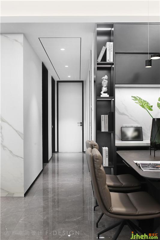 通往臥室的過道。過道運用簡潔利落的黑色窄邊框門構(gòu)成,現(xiàn)代風(fēng)格元素突顯而出。