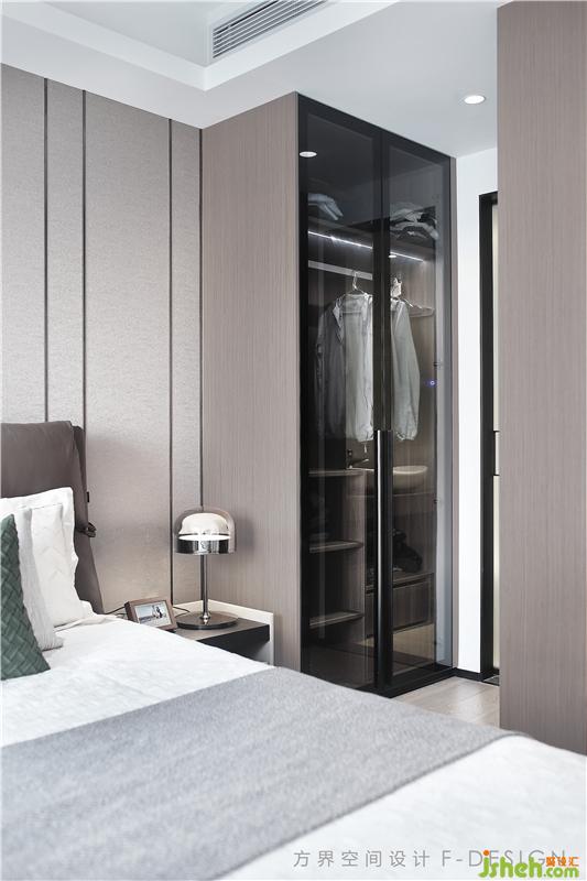 主臥用深淺色調(diào)搭配,彌漫著靜謐安寧的氛圍,沉靜理性,給業(yè)主休憩提供了安靜的環(huán)境。床頭靠背的一幅墨綠色裝飾畫,亦為空間增添一抹亮色。