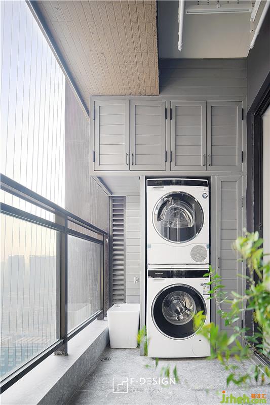 功能陽臺(tái),洗衣機(jī)加烘干機(jī)一起放置,還有定制的柜子,利用空間盡可能做到功能完備,整齊合理。旁邊白色的是拖把池,方便業(yè)主打理衛(wèi)生之需。