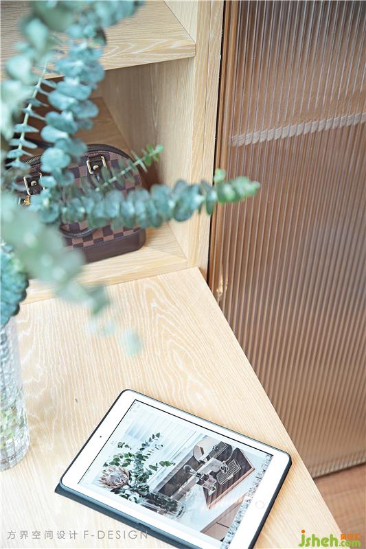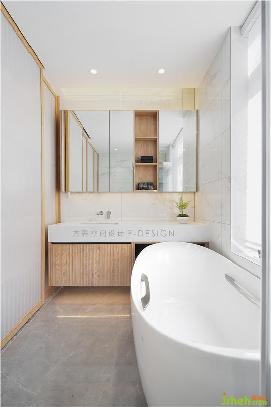 大面鏡子讓空間看起來更加寬敞,木色的儲物格、白色墻面,木質點綴,柔和的色彩表達出空間干凈整潔。
