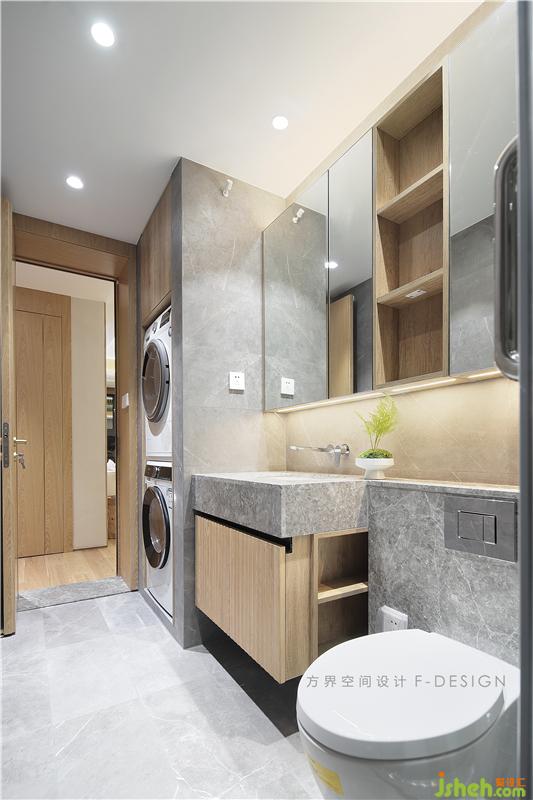次衛(wèi)也是呼應整個空間的色調,洗衣烘干一體,干濕區(qū)域分離,干凈且易打理。