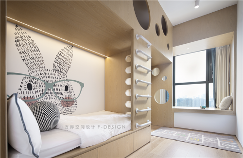 3、次臥做成了兩用的功能房,大型書(shū)桌滿足業(yè)主玩電腦辦公,靠墻做了收納柜和一張隱形床家里來(lái)客人了可以放下來(lái)做成臥室。原來(lái)兩邊的圍墻都切割掉換成玻璃推拉門(mén),當(dāng)玻璃門(mén)打開(kāi)整體活動(dòng)走線形成一個(gè)環(huán)圈;
