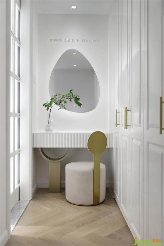 柜子采用白色烤漆板,搭配金屬拉手,讓整個(gè)空間的視野更加開(kāi)闊,明亮。梳妝臺(tái)上方用的是異形智能梳妝鏡,打開(kāi)開(kāi)關(guān),光線(xiàn)可以柔和空間。
