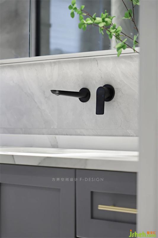 洗手臺(tái)的龍頭采用墻出龍頭,整體設(shè)計(jì)會(huì)更加干凈,美觀。黑色的龍頭和淋浴隔斷呼應(yīng)。