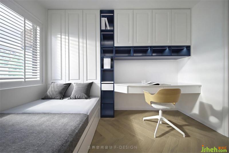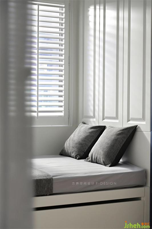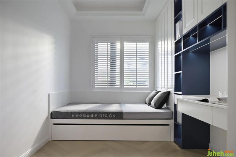 這個(gè)臥室的窗戶(hù),沒(méi)有用常規(guī)的布藝窗簾,是采用了空氣窗。空氣窗是可以調(diào)節(jié)角度的,關(guān)起來(lái)也可以起到遮光的作用。