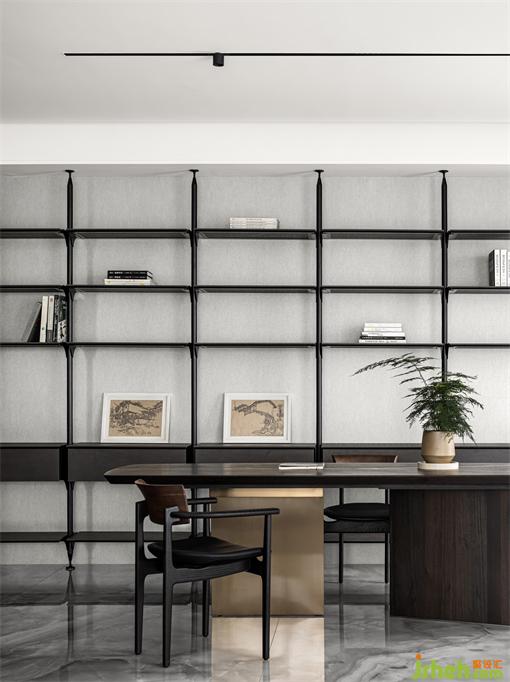 墨色肌理的大理石墻面,惠州私宅設(shè)計搭配木質(zhì)錯落的置物架,奔放且不失秩序感。