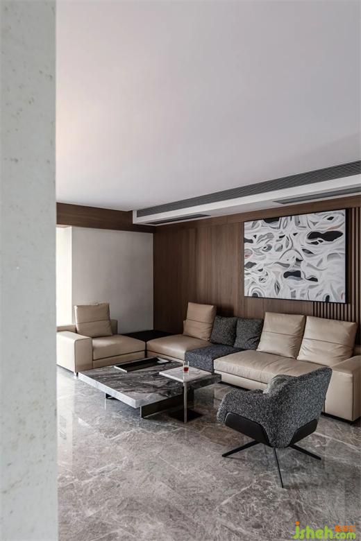 沙發(fā)運(yùn)用皮質(zhì)與布料完美結(jié)合的精湛工藝,華潤幸福里公寓設(shè)計(jì)通過力學(xué)和美學(xué)的完美融合,塑造舒適體驗(yàn)和超凡氣質(zhì)
