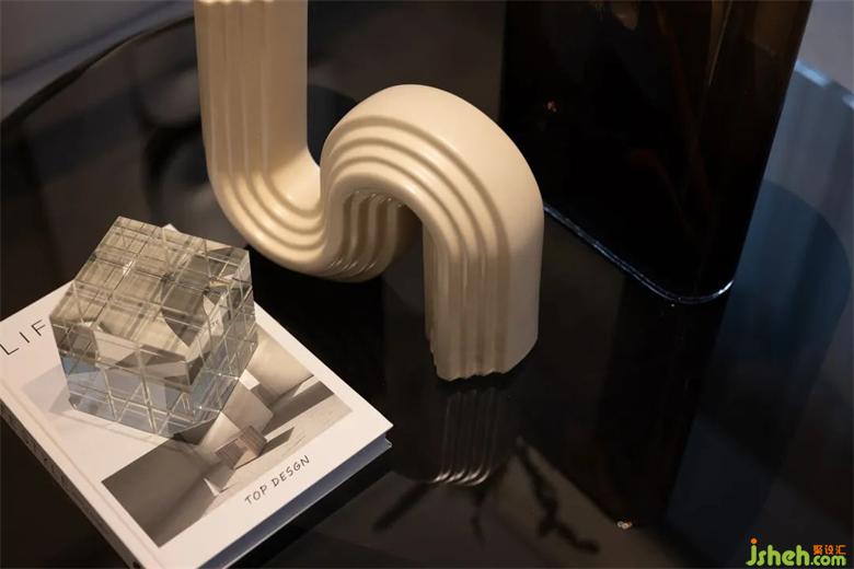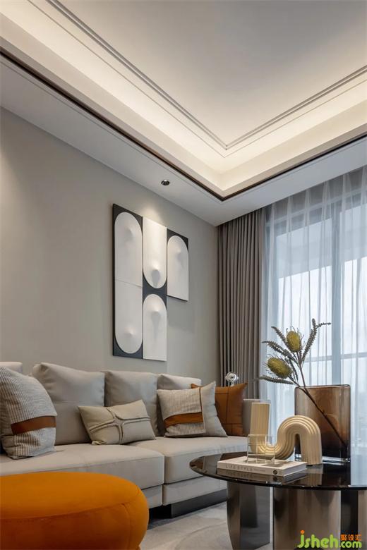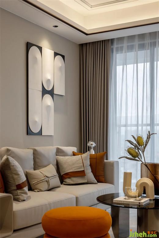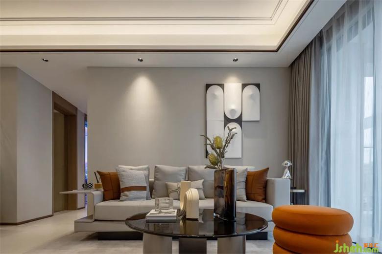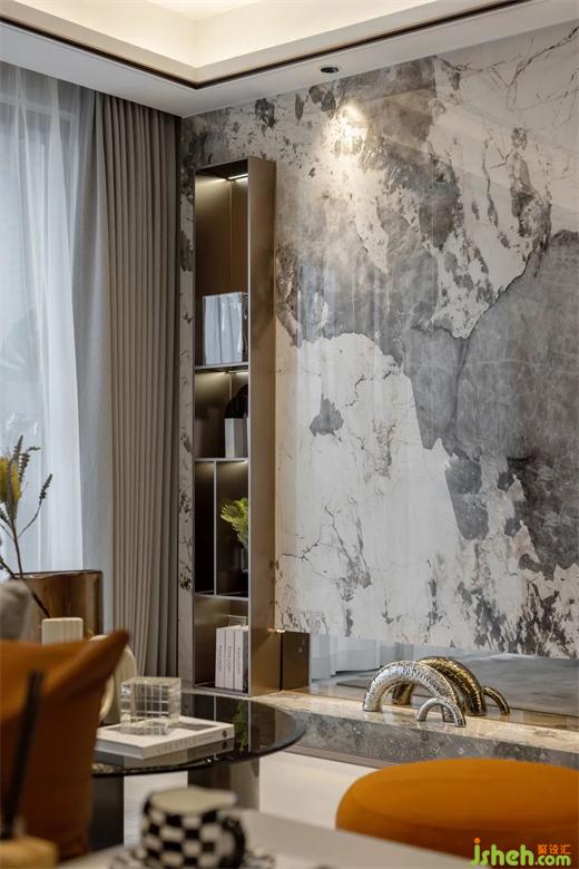 簡潔的線條,干凈沉穩(wěn),水墨紋理大理石柜面溫潤質感,德威樣板房設計將客廳變成一座博物館,出入即是一種專屬的藝術享受。