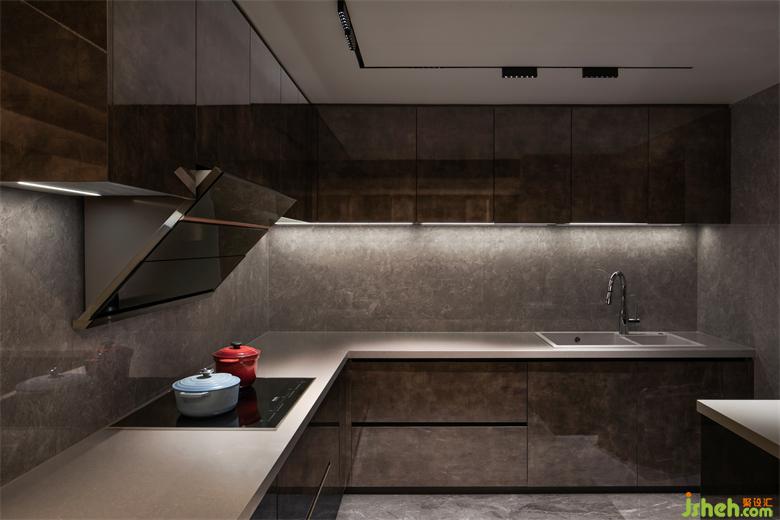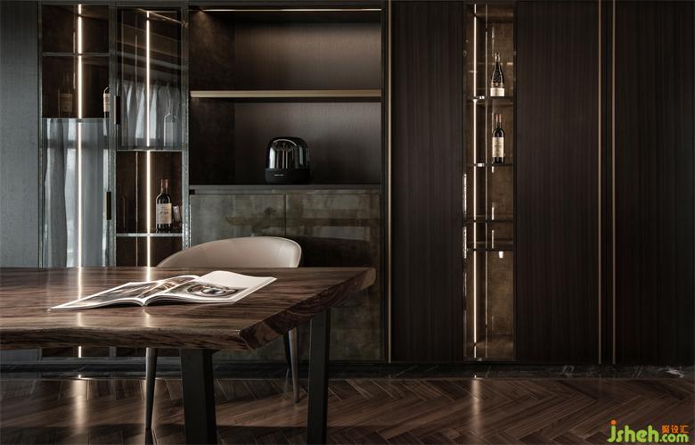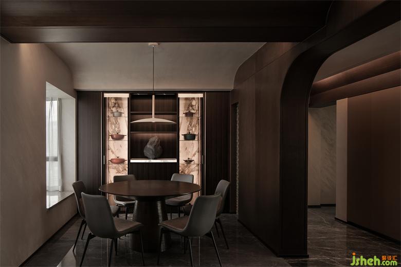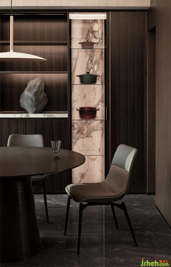 毗鄰的開放式餐廳空間,與廚房空間整體融合,TRID添睿室內(nèi)設(shè)計視覺上拉長空間的感官,相對獨立的空間裏,優(yōu)美的圓弧線帶來一種柔性之美。