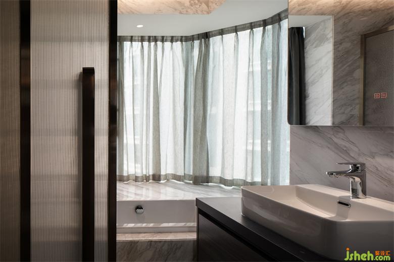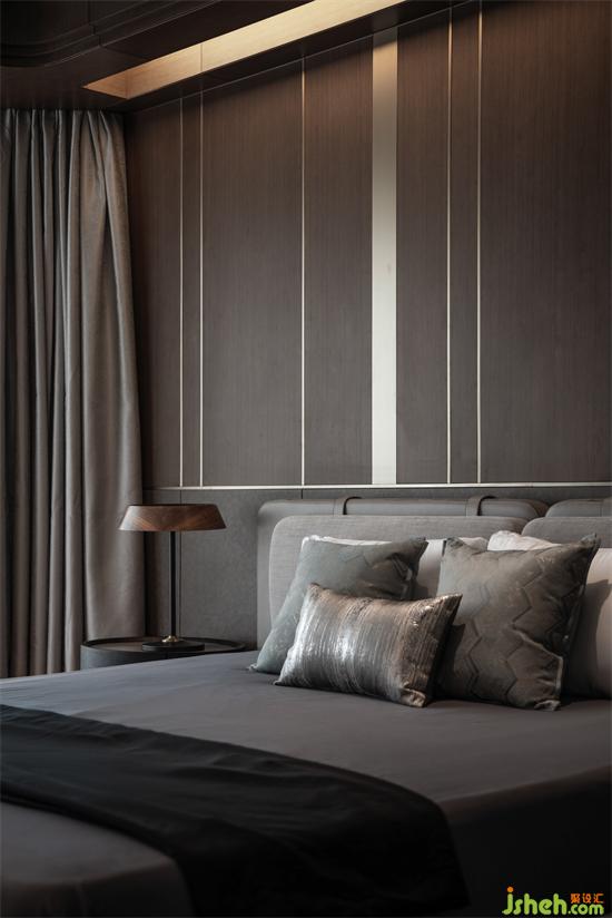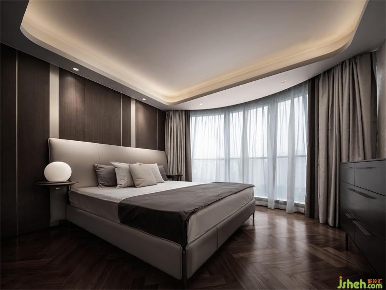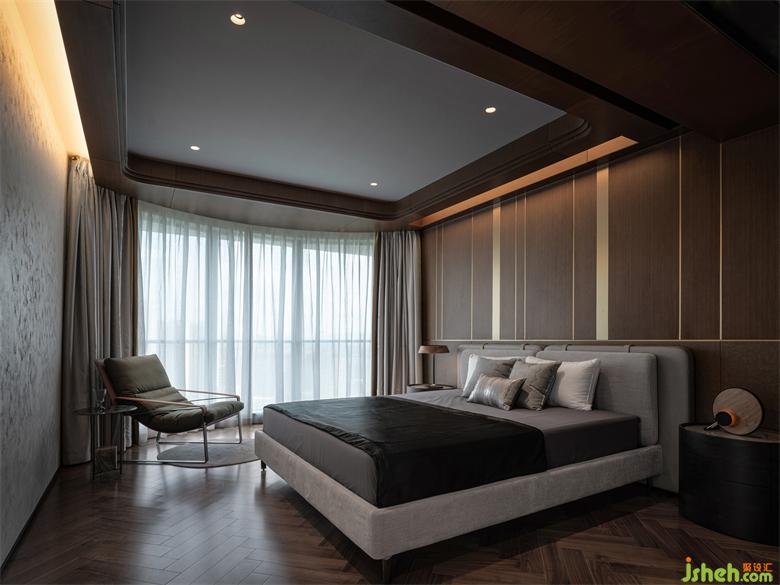 經(jīng)過衣帽連廊,繼而來到主臥,主臥套房延續(xù)圓弧元素,TRID添睿室內設計在空間中延伸和舒展,自然的深色木與淺色墻面色彩的對比分明,恰如其分,寧靜舒適。