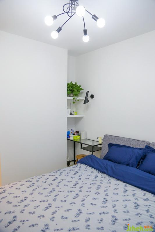 床頭的凹槽正好可以放入梳妝臺,上面利用空間嵌入隔板,即使囤貨再多,也不怕啦~