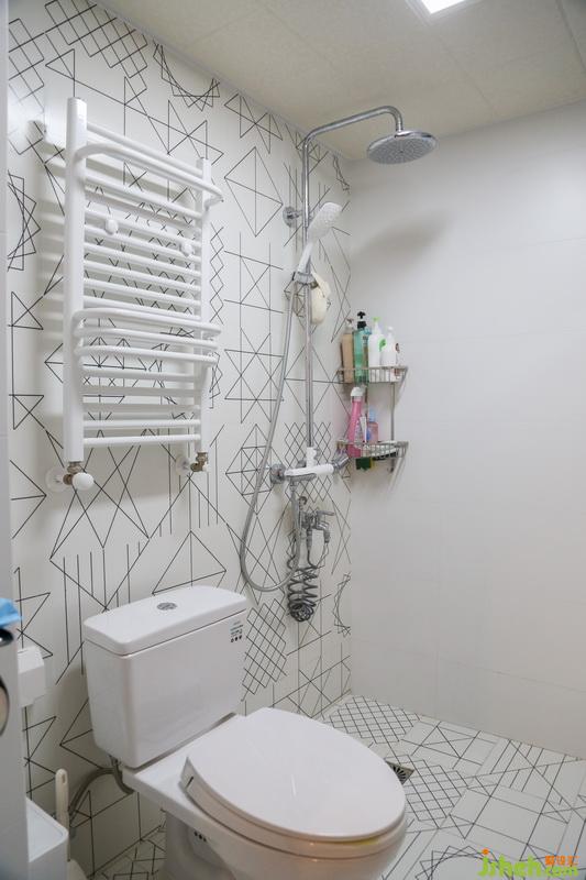 即使是小空間的衛(wèi)生間,也花了大心思。白色的幾何線條瓷磚,讓沐浴空間充滿樂趣。墻角的置物架和馬桶上方的毛巾架,滿足了瓶瓶罐罐的收納需求。