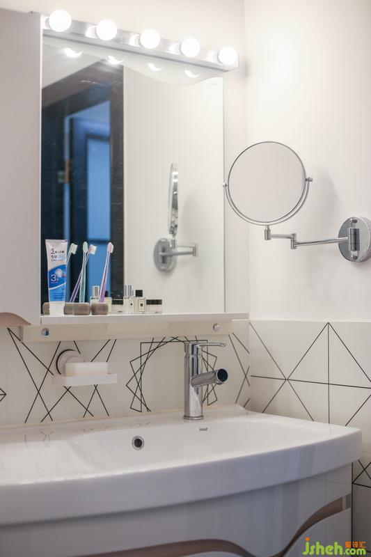 在洗手臺區(qū)域,我們除了安裝浴室鏡,還貼心地裝上了可供360°旋轉(zhuǎn)的化妝鏡,鏡子前設置了一排鏡前燈。充足的光照,讓女主人化妝變得極其方便。每天出門都能漂漂亮亮噠~