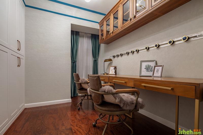 這間書房主要充當(dāng)辦公和儲藏區(qū)域。特意選用了復(fù)古的桌椅和吊柜,hold住空間的質(zhì)感。沿墻面分布著一排插座,可以同時給多個電子產(chǎn)品充電,辦公超爽滴~
