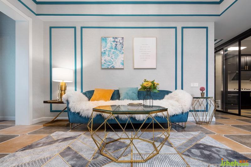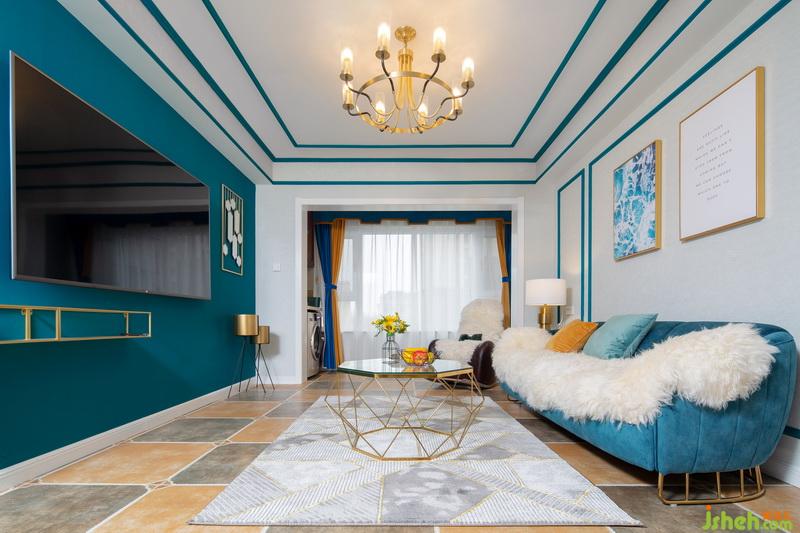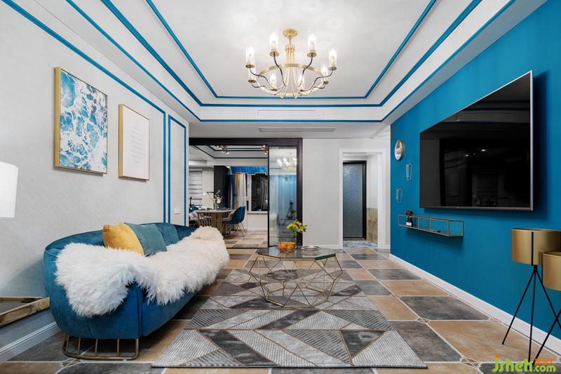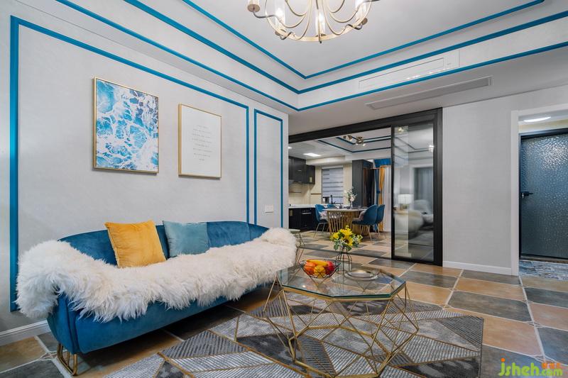 一進門,這套作品就已經(jīng)很驚艷惹!藍色的線條配上燦爛的燈光,流光溢彩間給人一種美的享受,原本過于狹窄的過道,成了藝術(shù)走廊。地面用不同的花磚劃分出區(qū)域,墻面的藍色線條一直延伸到客廳,將各個獨立的空間連貫起來。