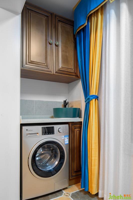 與客廳相連的陽臺,可以說是一個非常有心意的設(shè)計了!除了洗衣機,還設(shè)置了單獨的洗手盆,可以洗滌小件衣物。頭頂?shù)牡豕?,輕松搞定陽臺收納!
