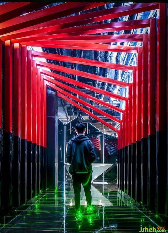 一開始進(jìn)門引入眼簾的就是紅黑結(jié)構(gòu)的鋼架,地面上綠色的激光線,營造出神秘的未來視覺感,白色的不規(guī)則造型前臺作為整個空間的提亮。